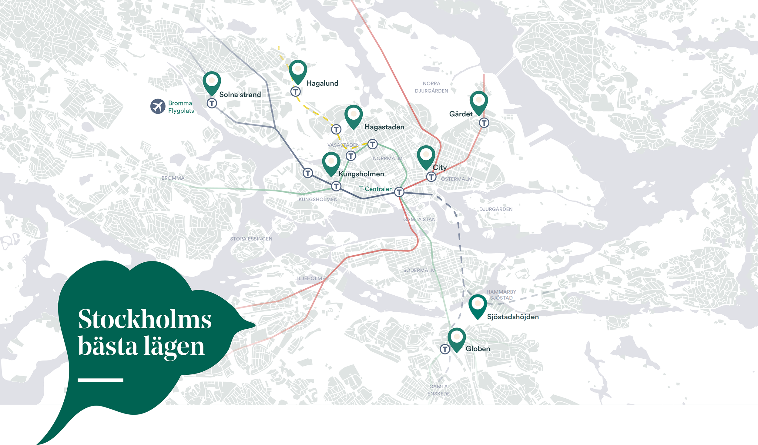 Tillgänglighet och ett attraktivt sammanhang är viktiga utgångspunkter när vi väljer de platser där vi ska vara verksamma. I ett samhälle där vi strävar efter att göra alltmer hållbara val är det allt viktigare att kunna åka kollektivt, helst spårbundet, mellan bostad och arbete. Alla våra fastigheter ligger därför i tunnelbanenära lägen, det gäller inom några år även fastigheterna i Hagalund genom utbyggnaden av den Gula tunnelbanelinjen.