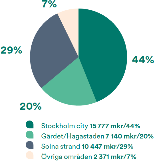 Vi utvecklar fastigheter och områden på strategiskt viktiga platser med goda framtidsutsikter. Bland våra satsningar återfinns Nybrogatan 17 på Östermalm, Norra Station i Hagastaden och Origo i Solna strand.