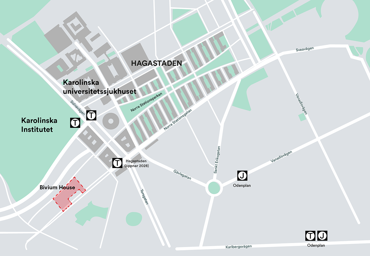 Att ta sig till och från Hagastaden är enkelt, och enklare kommer det att bli. 2028 öppnar tunnelbanestationen Hagastaden med en entré vid Torsplan, knappt 200 meter från Bivium House. Det är även nära till S:t Eriksplan och Odenplan/Stockholm City, som båda är viktiga knutpunkter för Stockholms kollektivtrafik. I Hagastaden har du också flera busslinjer inom gångavstånd.