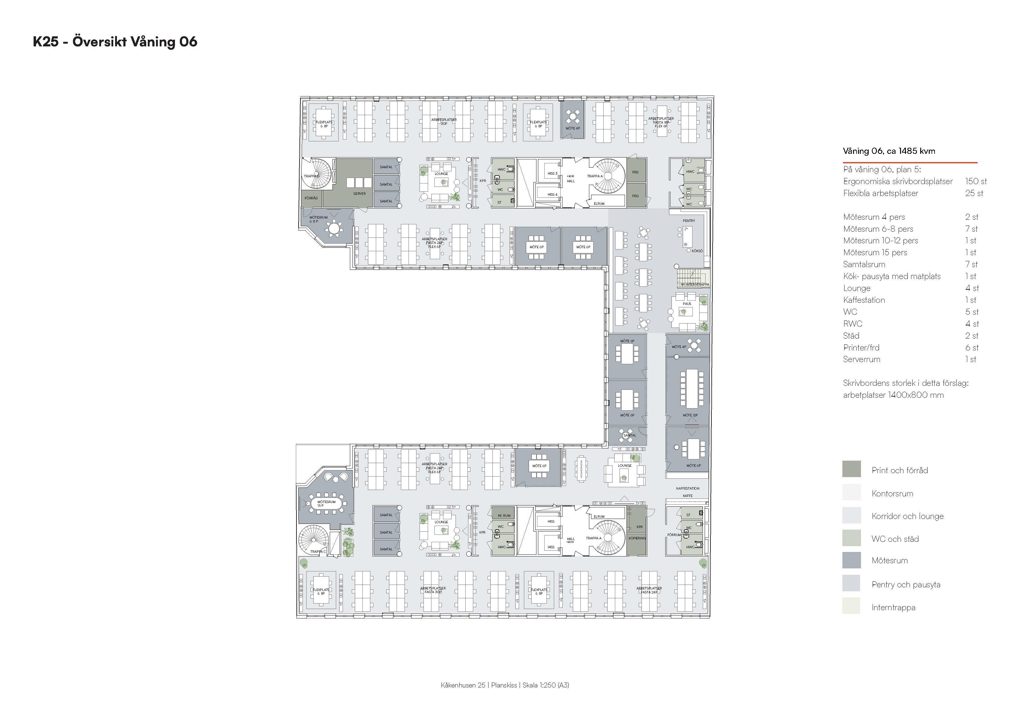 Hyr våning 6 och 7 och skapa ett drömkontor om 2 860 kvm med plats för cirka 315 personer. En generös interntrappa binder samman de två planen till en naturlig helhet. Planlösningen kombinerar öppna ytor med fasta och flexibla arbetsplatser, stängda kontorsrum samt mötesrum i olika storlekar. Här finns också gott om pausytor för gemenskap och spontana samtal. Kontorets hjärta finns på plan 6, ett öppet pentry med köksö och lounge.
