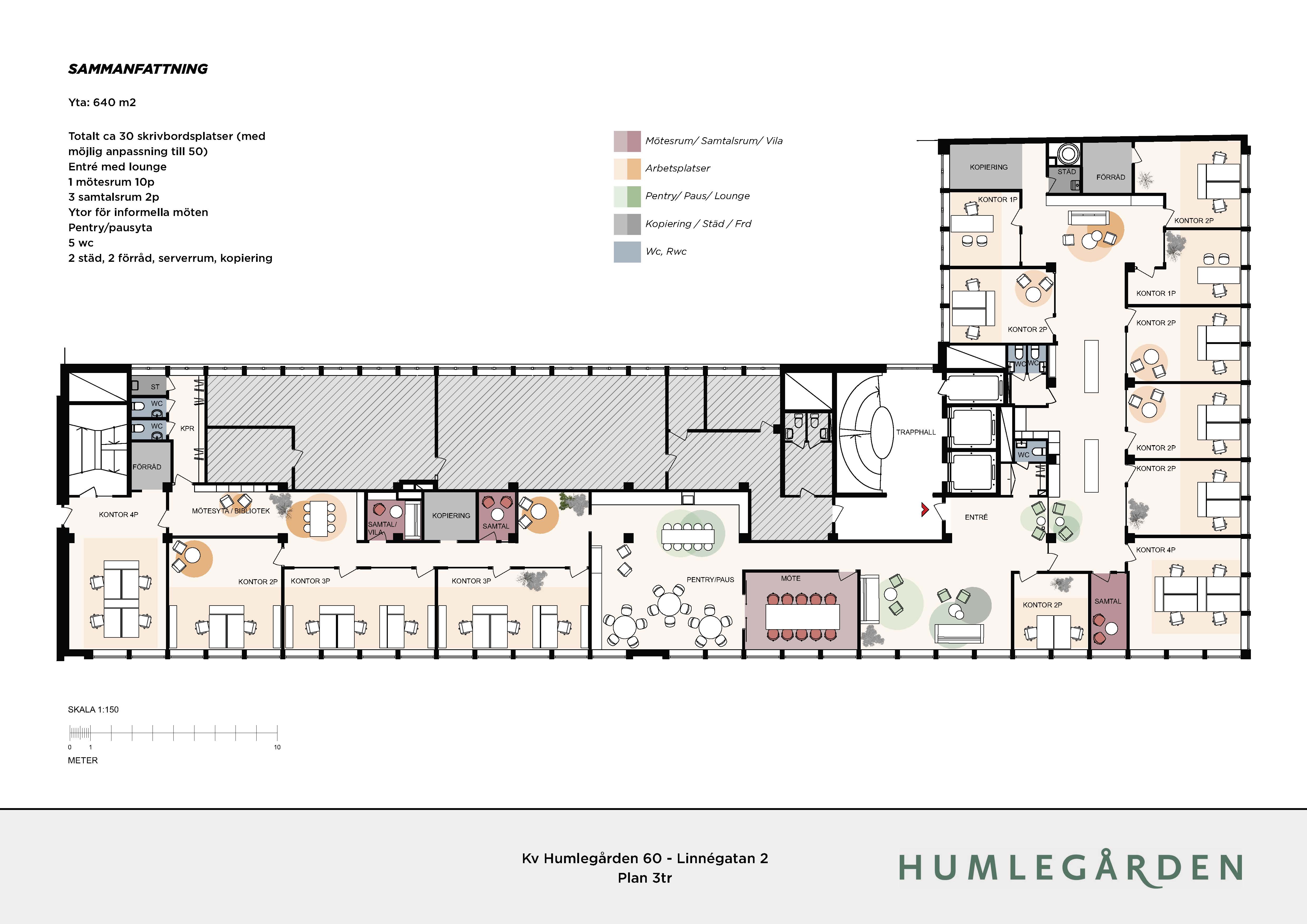 Kontorslokalen har en planlösning som består av mestadels kontorsrum, vilket ger möjlighet till enskilt arbete och möten i avskildhet. Lokalen är utrustad med moderna faciliteter och erbjuder en bekväm arbetsmiljö för alla medarbetare. Med en total yta om 640 kvm finns det gott om utrymme för både individuellt arbete och samarbete i team.