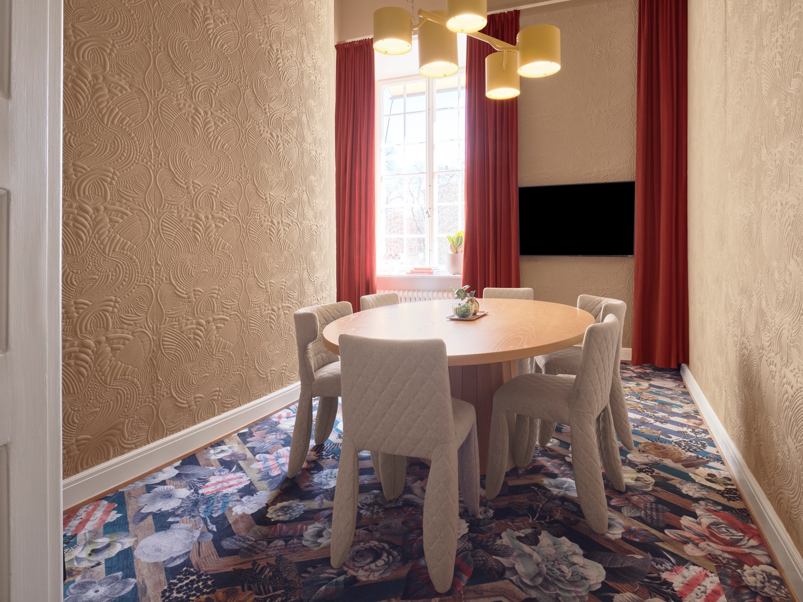 Ett rum med intim atmosfär och rund sittgrupp – perfekt för samtal eller intervjuer.
