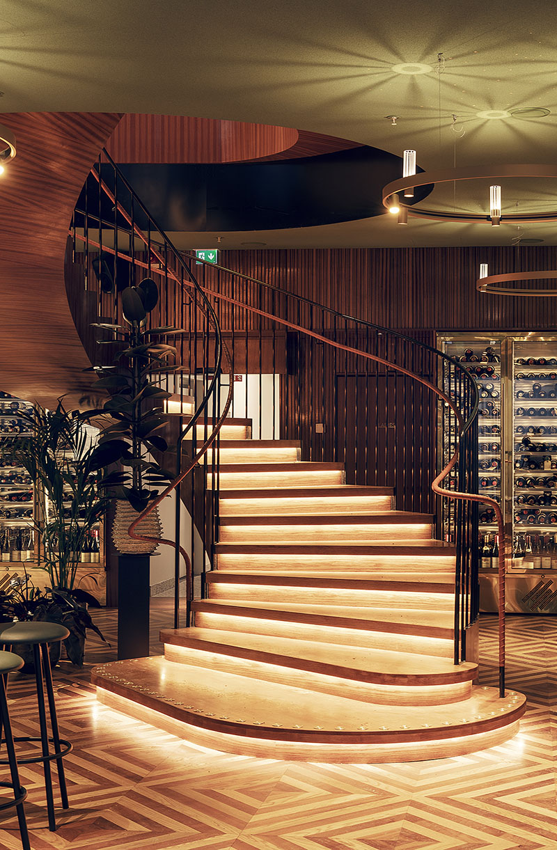 En svepande trappa, som hämtad ur en Hollywood-film, leder upp till själva matsalen som ligger i det nybyggda huset ovanför det som tidigare var en biograf. Med omkring hundra sittplatser är det en rejäl matsal, med öppet kök. Även här finns obokningsbara barplatser där man kan följa kockarnas arbete.