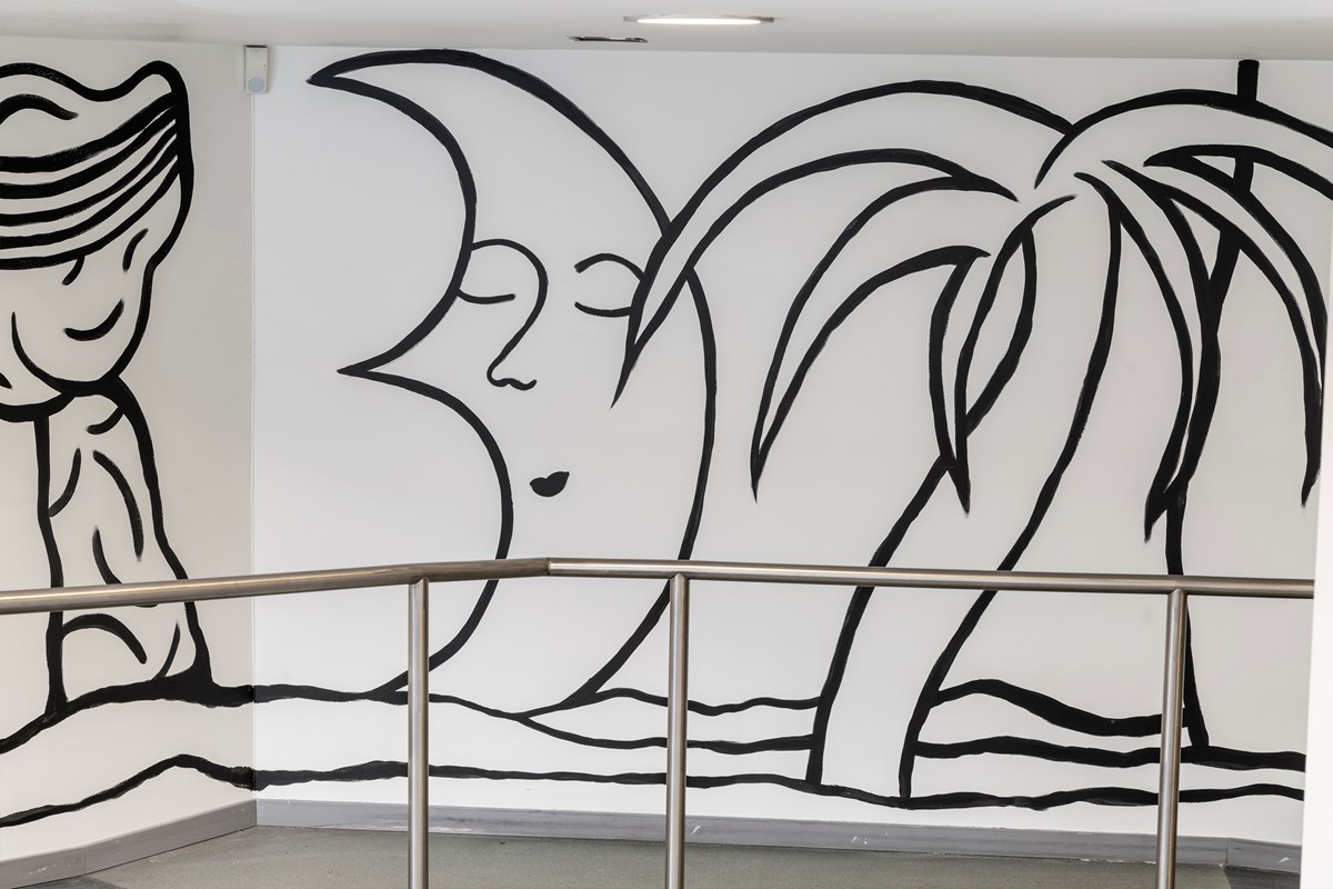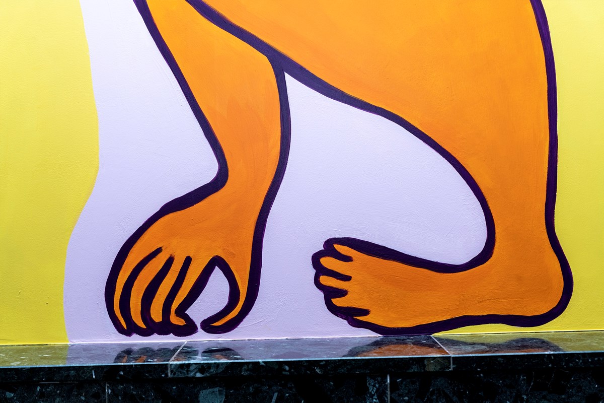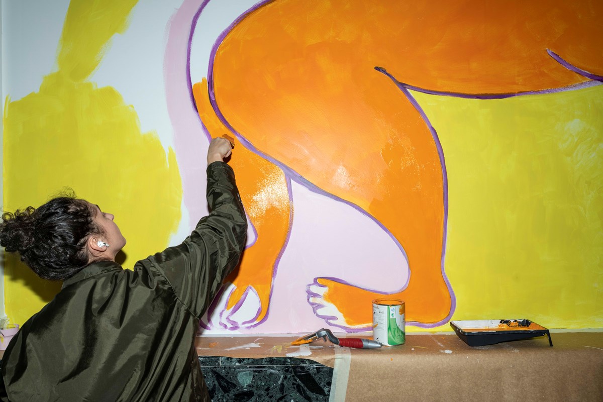 – När jag började fundera på uttrycket var det färgerna som jag bestämde mig för först. Det glada, mjuka och lustfyllda är något jag känner att platsen saknade. Jag vill göra folk glada med mina verk, ta dem till platser av öppenhet och lust, där sinnet får vila och slappna av. När jag gjorde dessa målningar så lyssnade jag mest på en och samma spellista om och om igen, det blir som att jag skapar en grund för en stämning för mig själv, men också för andra genom att tonsätta stämningen där dessa mjuka, snälla jättar som kommer in från gatan utanför och både skyddar och lyser upp Bilpalatset och vägleder dess residenter med en mjuk hand och fot.