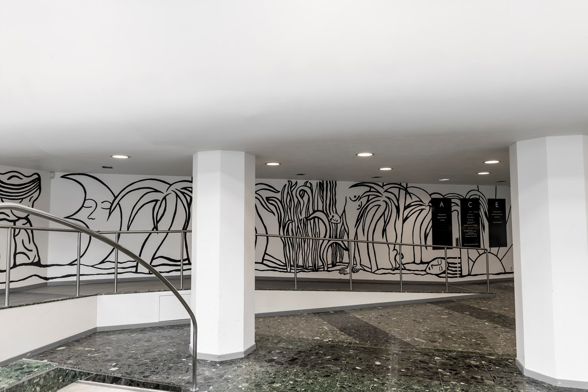 – Genom Humlegården har jag nu äntligen fått göra min första permanenta konstnärliga utsmyckning. Att det är i en byggnad som Bilpalatset är ännu roligare. Det var Paola Bjäringer som frågade mig om jag på uppdrag av Humlegården ville skapa muraler i båda entréerna, både på Norra Stationsgatan och Sankt Eriksgatan. Jag har fått konstnärlig frihet och förtroende, något som har varit otroligt viktigt. Jag tycker att resultatet av alla dessa komponenter har skapat något som kan leva vidare med och i tiden. Då jag jobbat mest nattetid har jag också fått uppleva en byggnad i tystnad, jag har fått se Bilpalatset färdas genom natten. Väggmålningarna är nu en del av karaktären, platsen och historien och jag hoppas att det bara är början på fler samarbeten tillsammans med Humlegården.