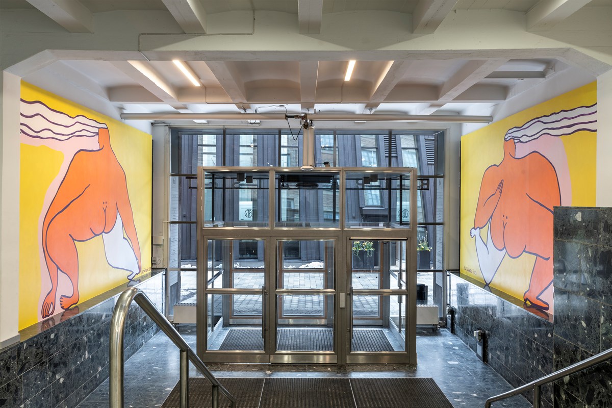 För Humlegården är samarbetet med formgivare och konstnärer både ett sätt att stötta kreativa utövare och skapa ett mervärde för hyresgästerna i sina fastigheter. Konst och estetik är viktiga beståndsdelar för att skapa en attraktiv, kreativ och inspirerande arbetsmiljö. Här berättar Alexandra Karpilovski själv om sina tankar bakom väggmålningarna ”The Gentle Giants”.