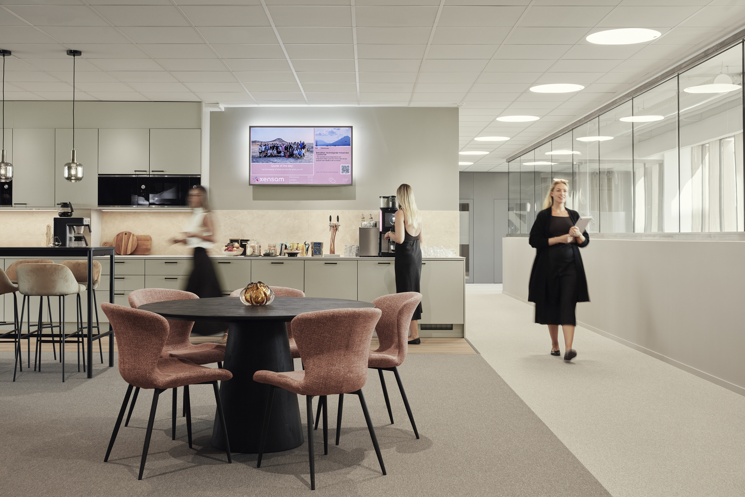 Tre trappor upp i huset finns Xensams nya kontor. Tanken bakom inredningen är att skapa en stilren men lekfull miljö med stor variation och flexibilitet. Här ska man kunna jobba fokuserat men också umgås – både under och efter arbetstid.