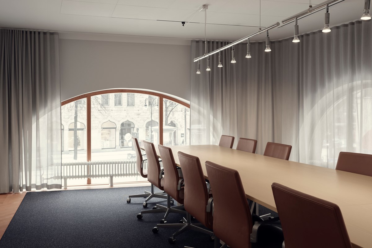 Lokalerna på Brunnsgatan bestod redan från start av många kvalitativa material som därmed kunde behållas. Armaturer, pentryn och glaspartier har renoverats och återbrukats och det befintliga ekgolvet har behållits. Just glas är ett särskilt viktigt material att ta omhand om, då det har en hög klimatpåverkan. Aktiva val ger också ringar på vattnet – genom att ombestycka infällda armaturer till LED kunde till exempel undertaken behållas. Nya produkter och material har valts med omsorg, med målet att hitta klimatmässigt smarta lösningar i största möjliga utsträckning.