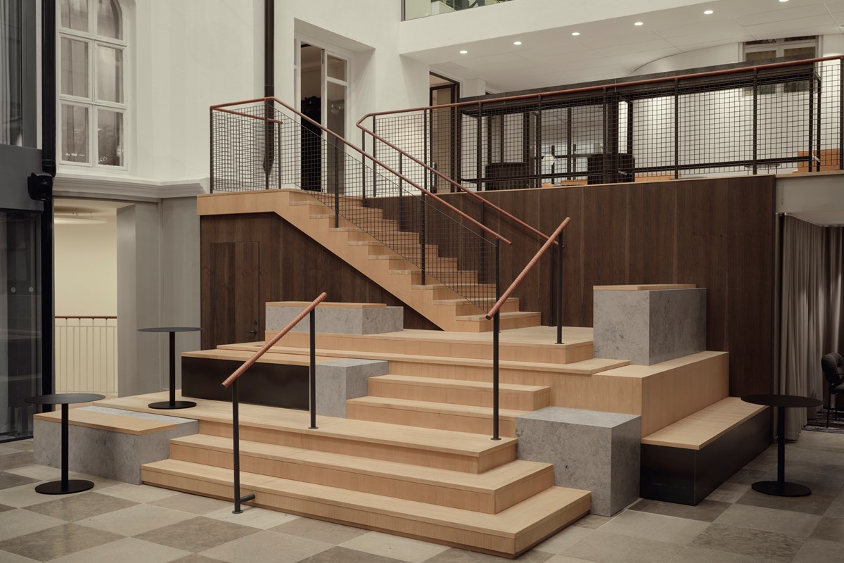 Genom att ge ytor nya funktioner kan de nyttjas på ett mer effektivt sätt. Ett exempel på detta var en befintlig trappa i mitten av lokalens stora atrium, som integrerades i en ny gradäng med förbättrad akustik. Genom att bevara trappan gjordes en stor klimatbesparing, samtidigt som slutresultatet är en mer flexibel yta och en naturlig mötesplats som även kan användas vid större sammankomster.