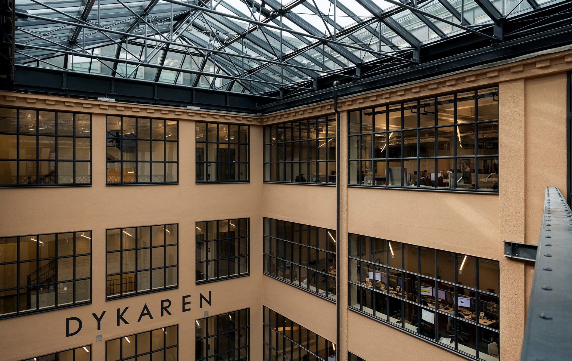 De gamla industrilokalerna har varsamt omvandlats till inbjudande och moderna kontorslokaler. Stora ytor och höga fönster med generösa ljusinsläpp ger en ljus och öppen atmosfär.