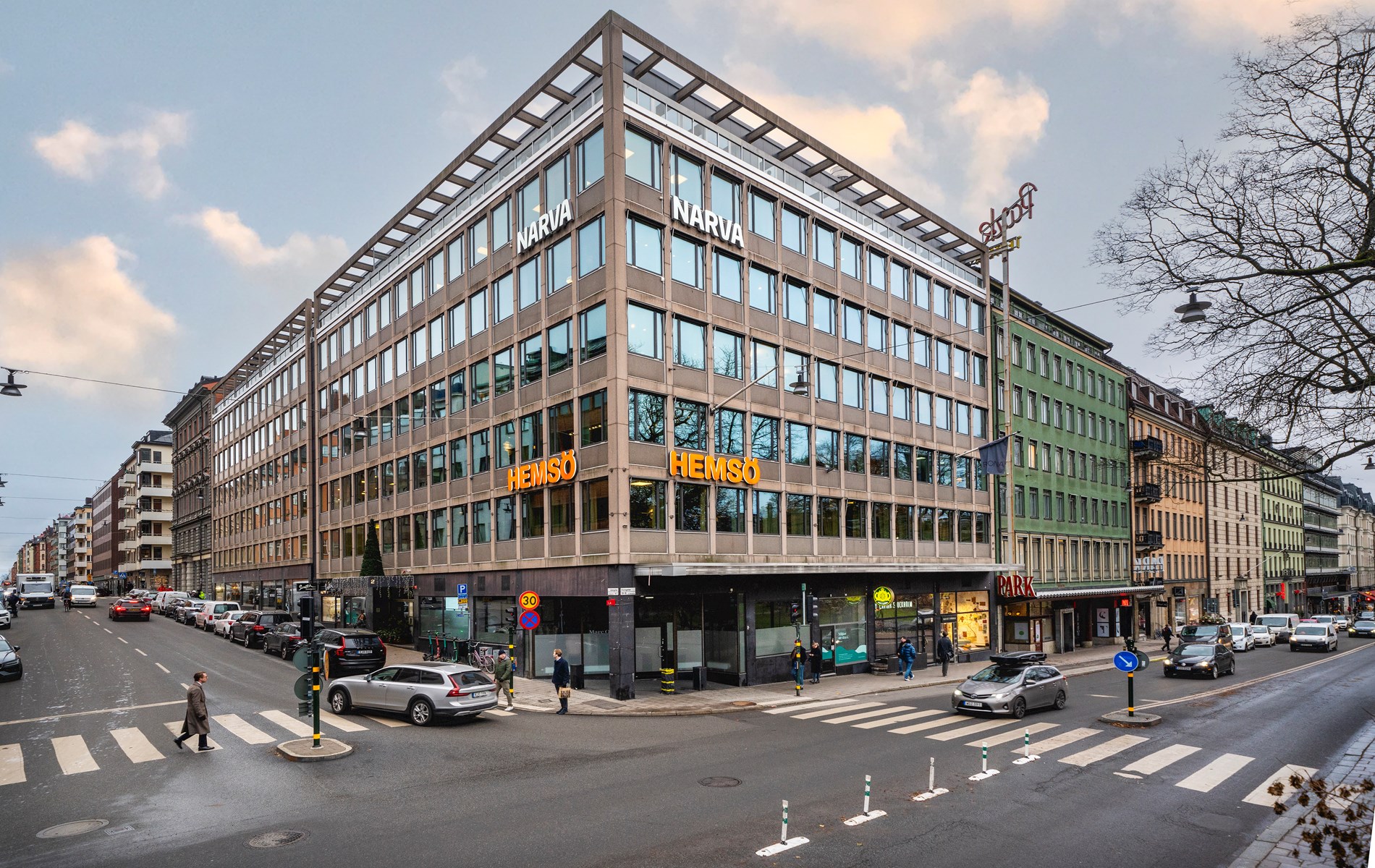 På Brahegatan finns nedfart till parkeringsgarage i två våningar samt infart till en innergård med ett fåtal parkeringsplatser.